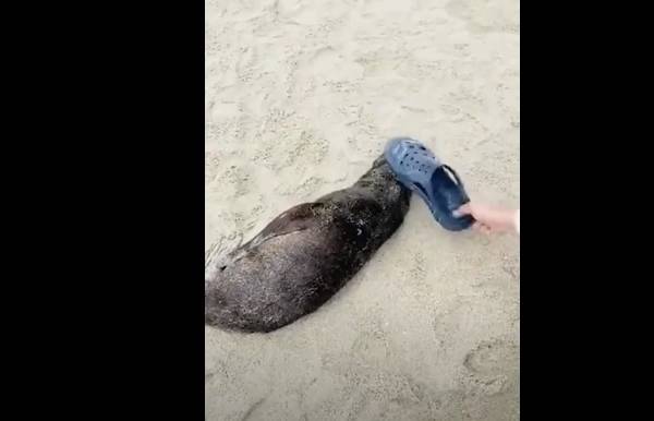 En las imágenes, subidas originalmente a Tik Tok, se observa al hombre golpear con una sandalia de plástico más de 10 veces el cuerpo del animal, hasta que consigue despertarlo. Al advertir la presencia de los visitantes, el pequeño león marino volvió rápidamente al mar.